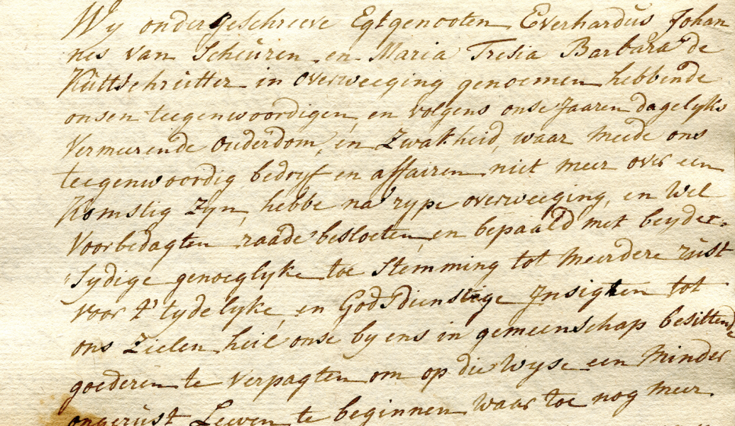 Wij hebben, als gevolg van onze leeftijd en teruglopende gezondheid, grote moeite ons bedrijf en andere bezigheden nog verder uit te oefenen. Wij hebben daarom, na rijp beraad en weloverwogen, gezamenlijk besloten om, gesteund door onze godsdienstige inzichten, al onze gemeenschappelijke bezittingen te gaan verpachten.
