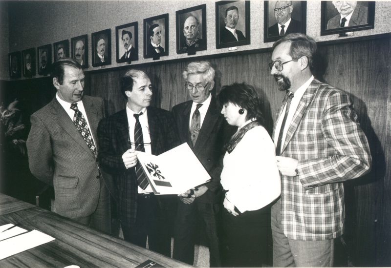 Wethouder Jan Tikken uit Lathum; onbekende persoon, wethouder Henk Meurkes uit Giesbeek (tevens loco-burgemeester), onbekende dame, gemeentesecretaris Jan Mullink.