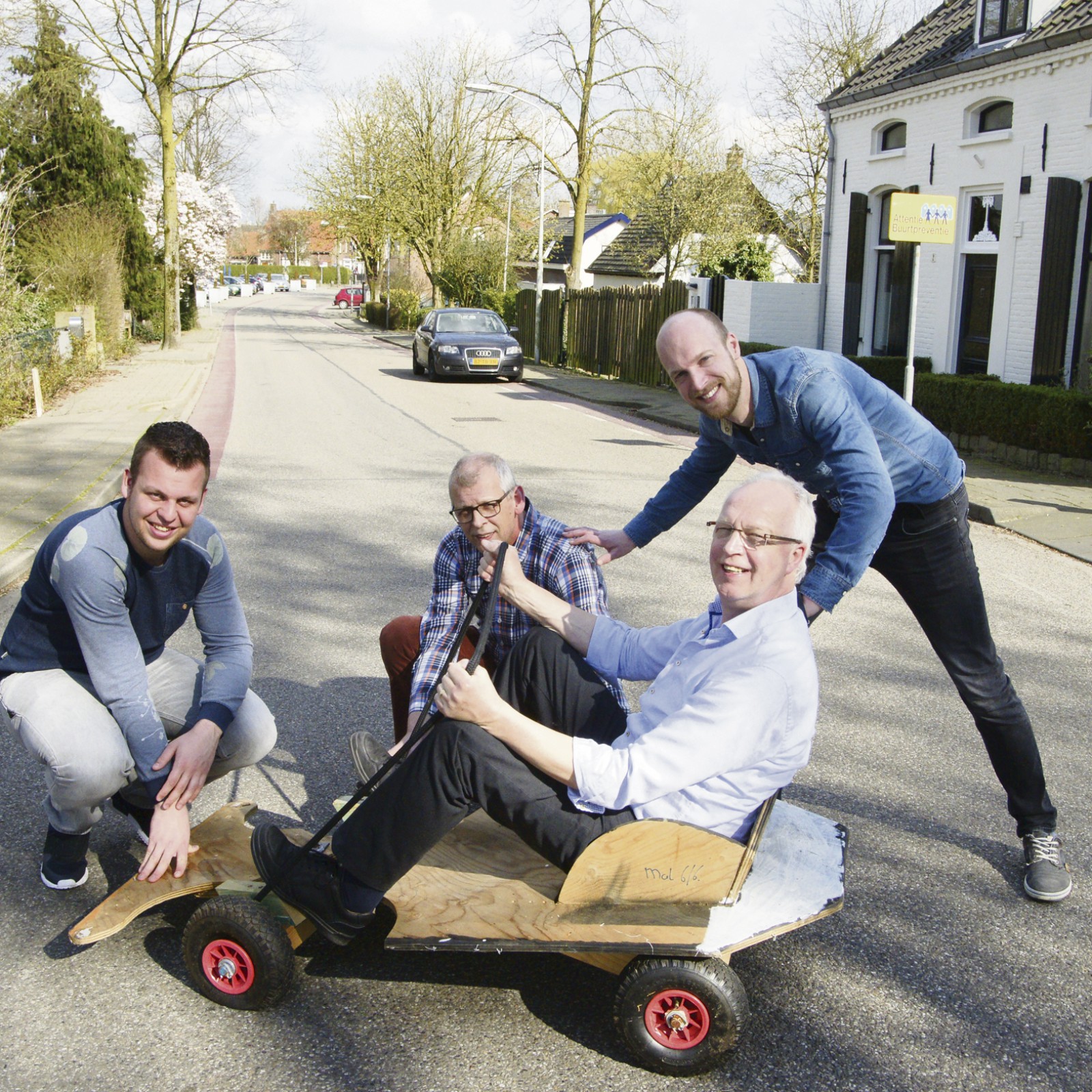 De organisatoren van de eerste Westervoortse zeepkistenrace. V.l.n.r.: Roy en Theo Wilting en Martin (zittend) en Martijn Wieleman. Op de foto ontbreken Clemens van den Oord, Johan Paape, Tim van Gullik, Timo Riphagen en Gerco Koenen.
