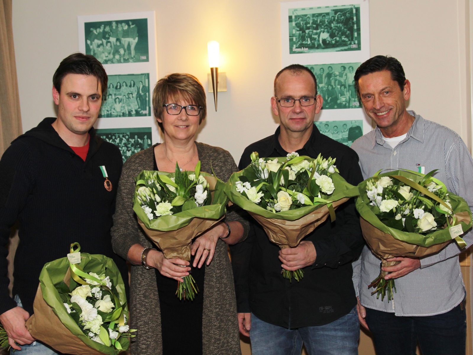 Tijdens de traditionele nieuwjaarsbijeenkomst van Sportclub Groessen zijn vrijdag 8 januari zes jubilarissen gehuldigd voor hun 25 jaar of 40 jarig lidmaatschap. Op foto vanaf links Victor Moelands (25), Marian Roelofs (40), Fred Driessen (40) en Joop Zwartkruis (25). Zij ontvingen ieder een jubileumspeld en een bos bloemen. Niet op foto de jubilarissen Alfons Janssen (40) en Geert Hoksbergen (25).