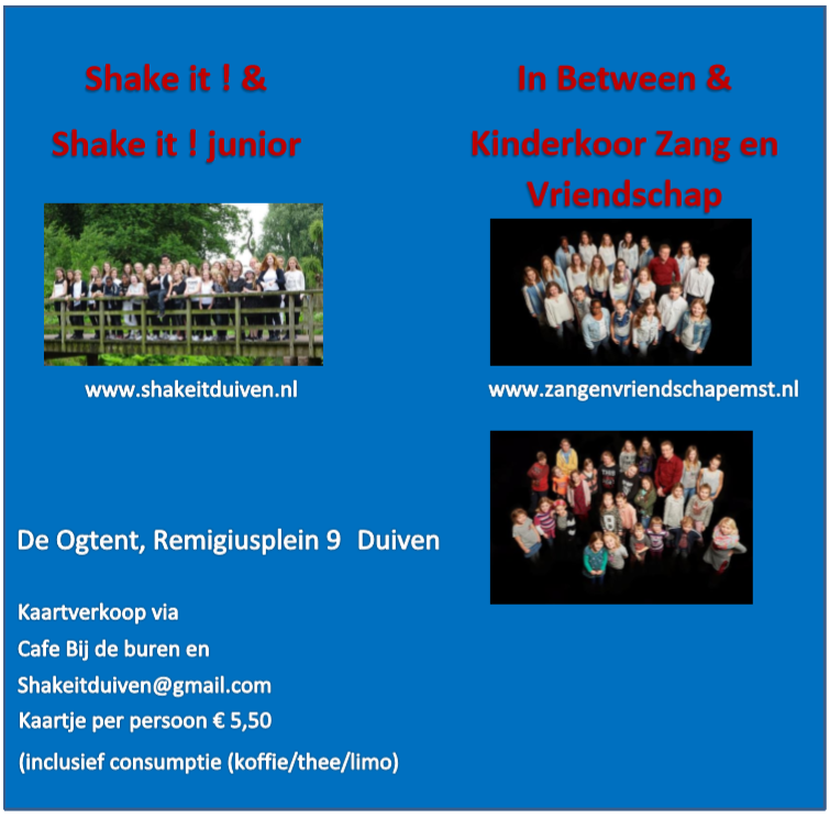Deze jeugdpopkorenshow belooft een spetterend feestje te worden met mooie, groovy popnummers. Kaarten zijn te bestellen via shakeitduiven@gmail.com of te koop bij Café bij de Buren voor euro 5,50 per stuk (incl. koffie/thee/limo). Kaarten die via het mailadres zijn besteld, kunnen op de avond zelf aan de kassa worden opgehaald. Op de avond zelf worden ook nog kaarten verkocht.