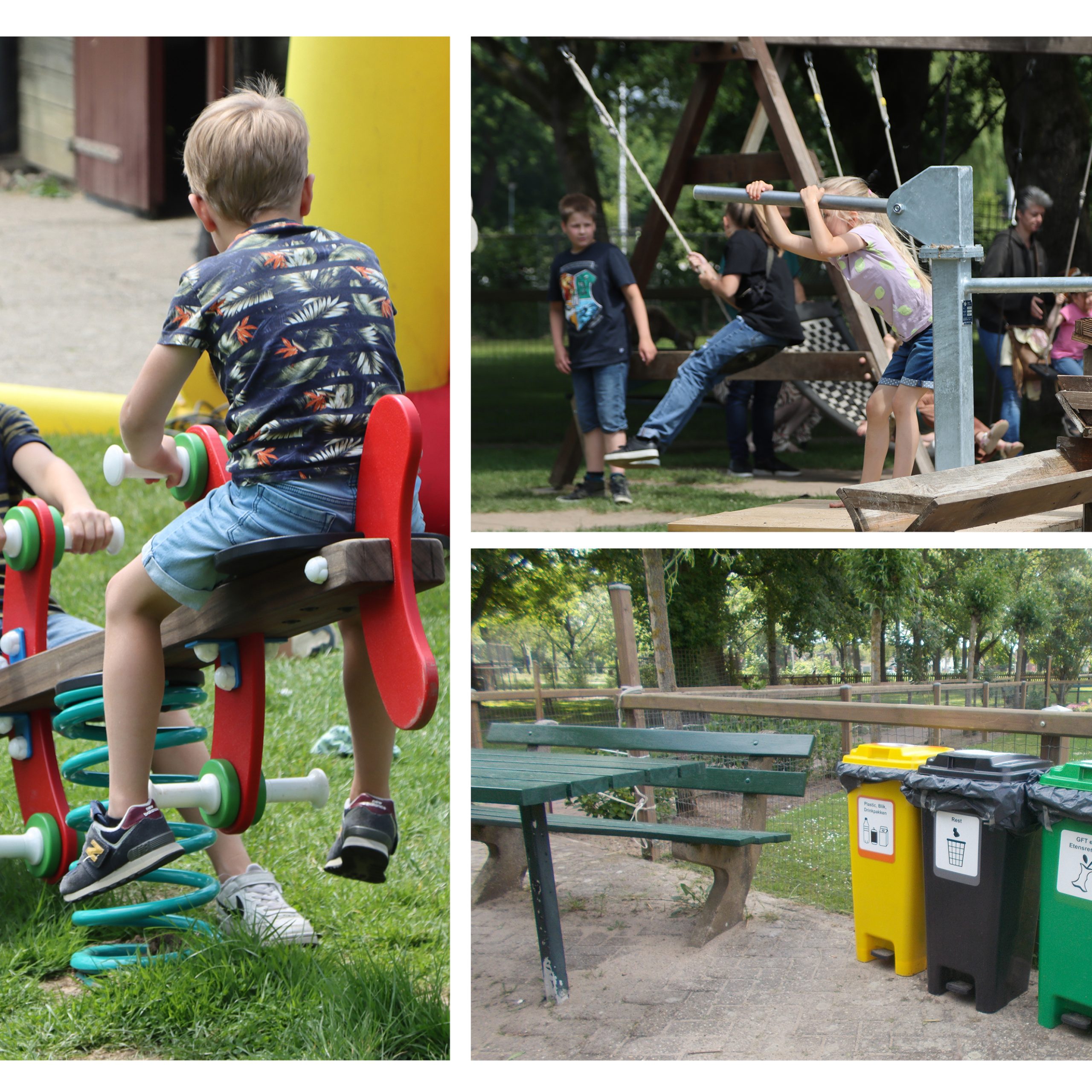 Zand en water is een fantastische speelcombinatie. Daarom is de kindvriendelijke waterpomp naast de zandbak geplaatst. De prachtige wipwap staat mooi tussen de andere wiptoestellen en glijbanen. De opvallende vrolijk gekleurde afvalbakken nodigen het publiek uit het afval keurig te scheiden: de drinkpakjes en plastic zakjes in de gele, de schillen en klokhuizen in de groene en de rest in de grijze bak. Zo blijft de speeltuin netjes schoon.