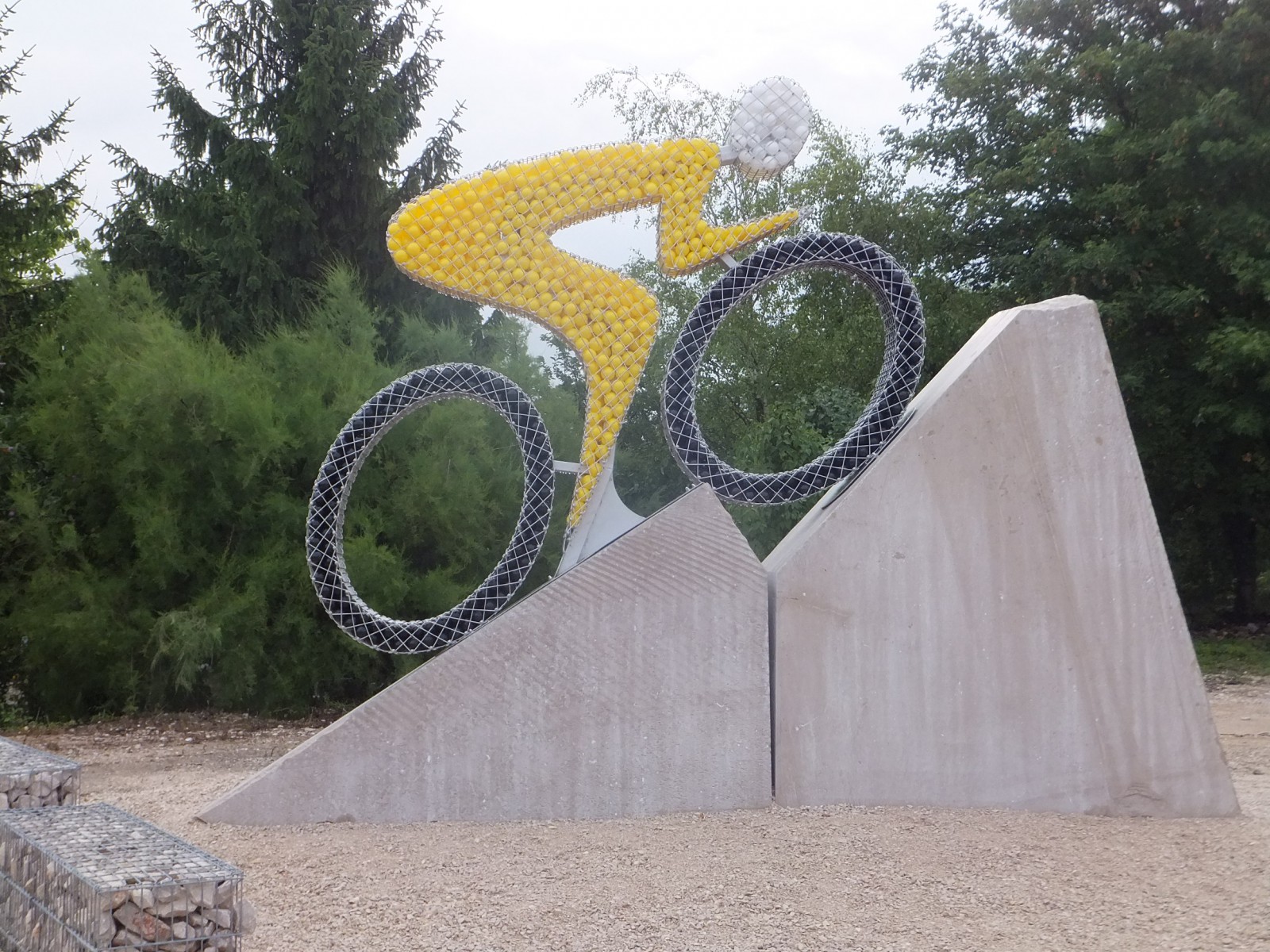 Overal zie je al aankondigingen en prachtige versieringen langs het parcours. Buiten de stad is de aankomst plaats, herkenbaar aan een zeer grote wielrenner.
