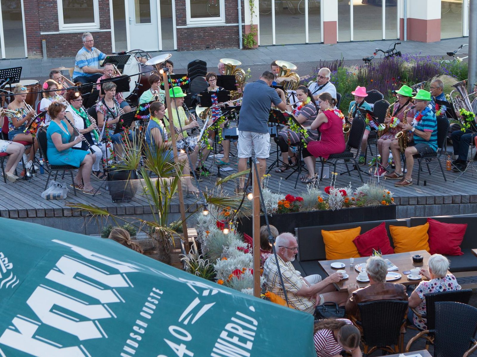 Nog voor het optreden begon, zat het publiek al op het terras. “Een mooie manier om binnen te komen,” aldus een tevreden voorzitter Laura Staring. Het programma verliep ook volgens plan. “We hebben ongeveer een uur muziek gemaakt. Alleen een windvlaag zorgde af en toe voor wat problemen met wegwaaiende partijen, maar gelukkig kennen we de stukken goed.”