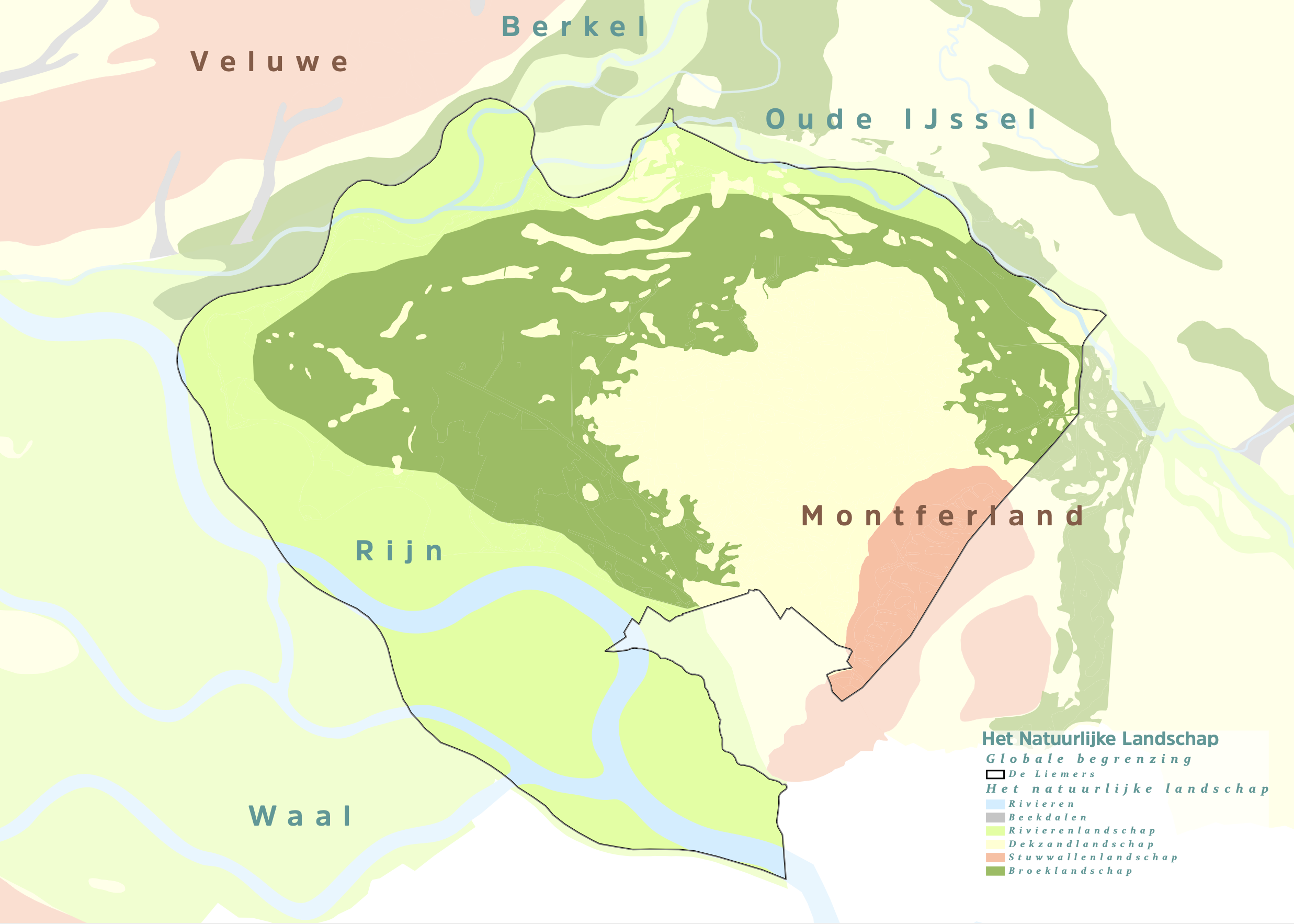 is gevormd. Tijdens de voorlaatste ijstijd, de Saale-ijstijd (370.000 – 130.000 jaar geleden), is de stuwwal van Montferland gevormd. De Rijn kwam toen nog via het dal van de Oude IJssel Nederland binnen en stroomde via de IJsselvallei naar het noorden van het land. De Weichsel- ijstijd (116.000 – 11.000 jaar geleden) was een ijstijd waar het landijs Nederland niet bereikte. In het koude klimaat en door de harde wind werd er veel zand in het landschap afgezet: het dekzand. Het welvende zandlandschap in de omgeving van Beek, Didam en Wehl is een typisch dekzandlandschap. Ook de hoge zandopduikingen – dekzandruggen en rivierduinen – in de omgeving van Westervoort, Duiven, Groessen en Zevenaar zijn toen ontstaan. In de laatste tijdsfase, het Holoceen (vanaf 11.000 jaar geleden), werd het weer warmer. De Rijn stroomde inmiddels door de Gelderse Poort en voerde veel sediment (klei, zand en grind) met zich mee. Door de rivierdynamiek veranderde het landschap, direct langs de riviergeulen, constant. Riviergeulen wandelden door het landschap, de Rijnstrangen zijn hier nog het levende bewijs van. Door de rivier werd in het laaggelegen komgebied klei afgezet. Deze natte, rijke bodems vormden een ideale voedingsgrond voor elzen, wilgen