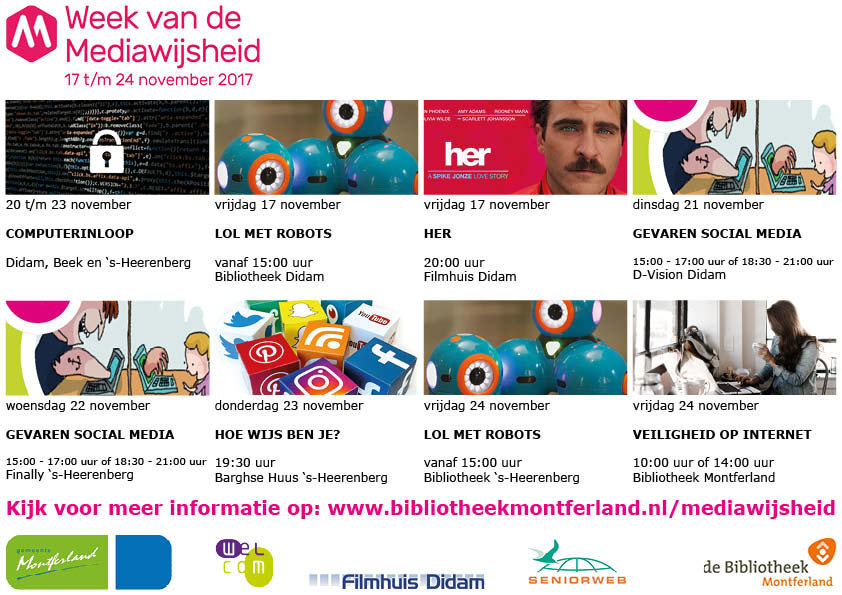 In Montferland is een breed programma samengesteld. Bibliotheek Montferland, het jongerenwerk van Welcom, de Gemeente Montferland, Filmhuis Didam en medewerkers van Seniorweb zetten vooral veiligheid op internet centraal.