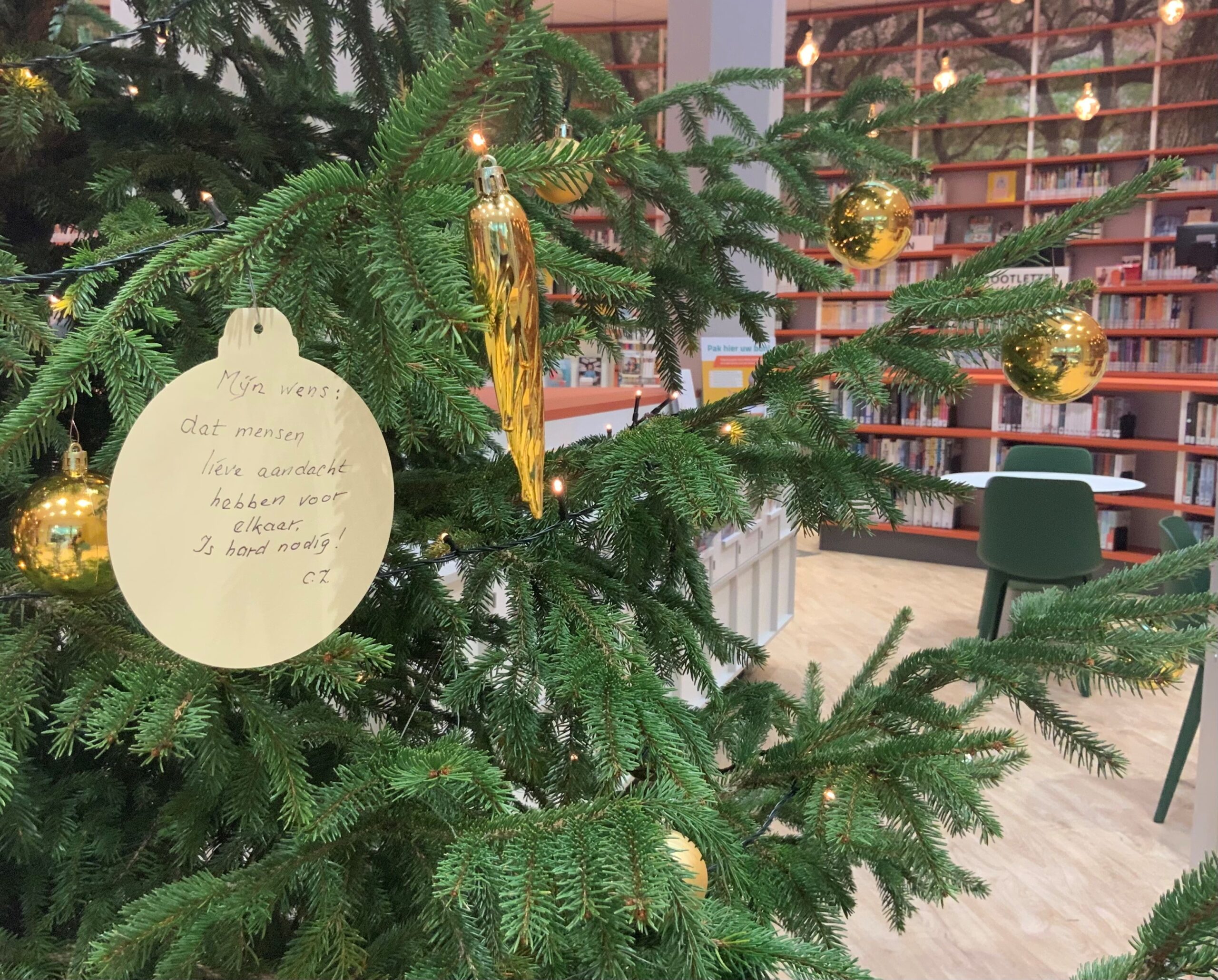 In de bibliotheek liggen kersthangers. Bezoekers mogen daar een kerstwens op schrijven of er een tekening op maken. Misschien is er iemand in het bijzonder die wel wat extra steun kan gebruiken? Met een persoonlijke kerstwens tussen de lichtjes van de kerstboom, zetten deelnemers aan deze actie iemand in het licht.