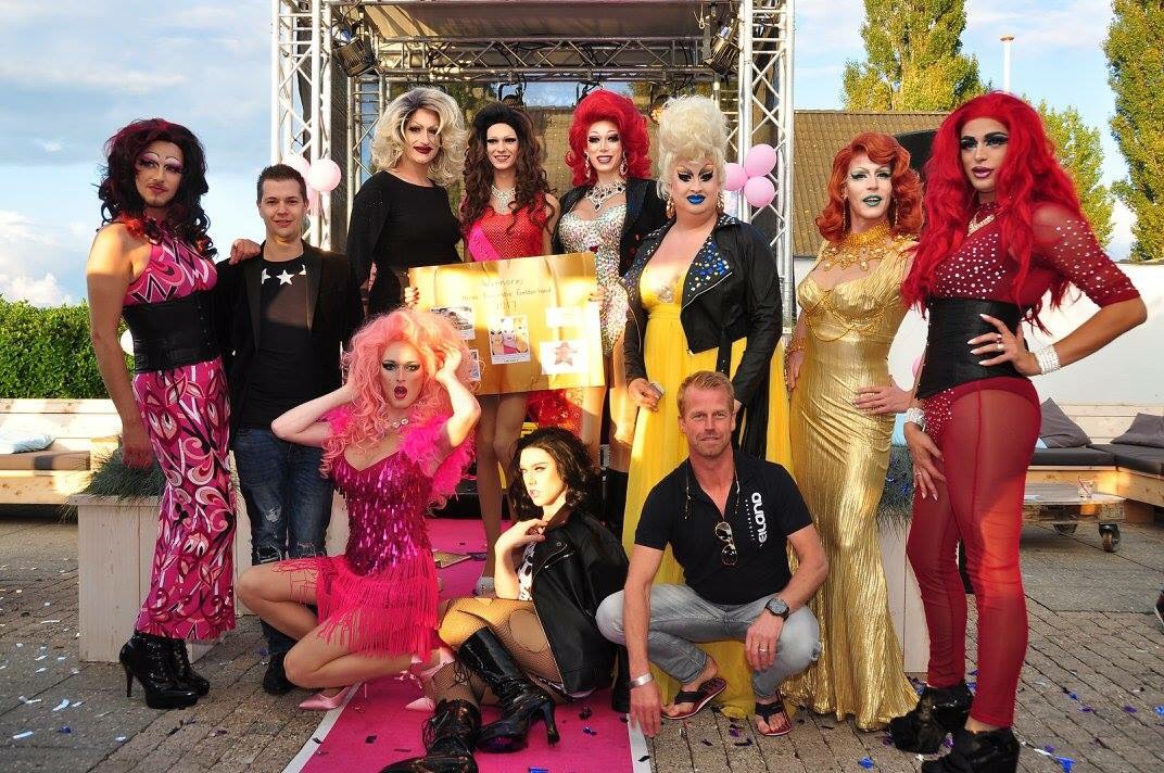 Drag queens en travesties ontvangen bij aankomst een gratis glas bubbels.