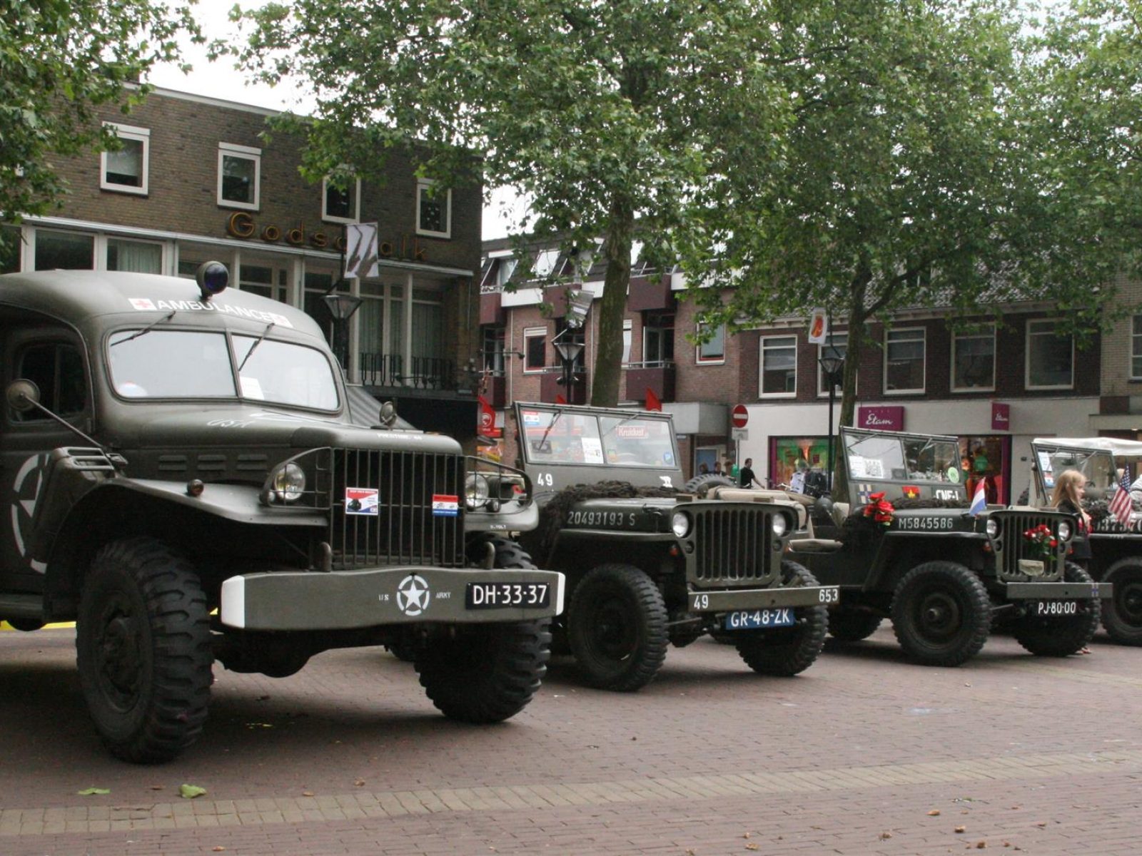 En: weer of geen weer, dat maakt niet uit. Het Raadhuisplein is op deze speciale dag volledig overkapt. Het programma start om 12.00 uur op het Raadhuisplein met een ceremonieel onthaal van militaire voertuigen door schutterij St. Andreas, Showband KDO, drumband Rheden, het trompetterkorps Arnhem, drumband Heelsum en burgemeester Jan de Ruiter. “We laten de Engelse geallieerden vanaf het westen, dus vanaf de Arnhemseweg binnentrekken”, vertelt William Thuis, voorzitter van de stichting Veteranen de Liemers. “Voor de Engelsen uit rijden Duitse voertuigen die de vlucht van de Duitsers uit Zevenaar nabootsen. Daarna komen de militairen van het Korps Nationale Reserve.”